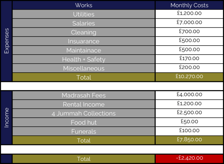 As you can see from the table below the Masjid’s expenses are higher than it’s income streams. This shows again why your donations are very important to us.